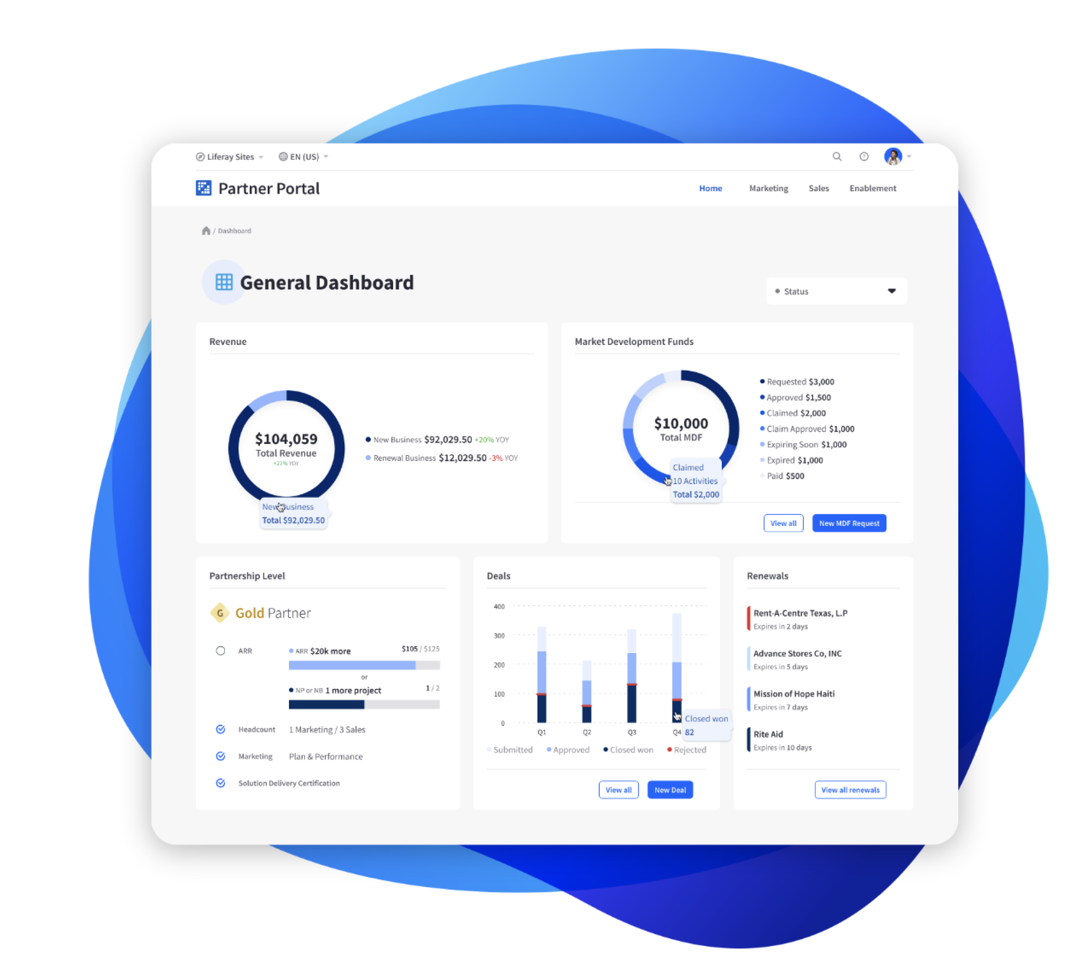 アプリケーション、コンテンツ ライブラリ、外部システムを1つのゲートウェイに統合することで、パートナーが効果的に販売するために必要なツールとリソースを接続します。