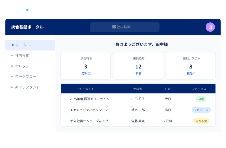 ※統合基盤とは、既存の複数システムをそのままつなげ、情報・権限・AIを一元管理する仕組みです。