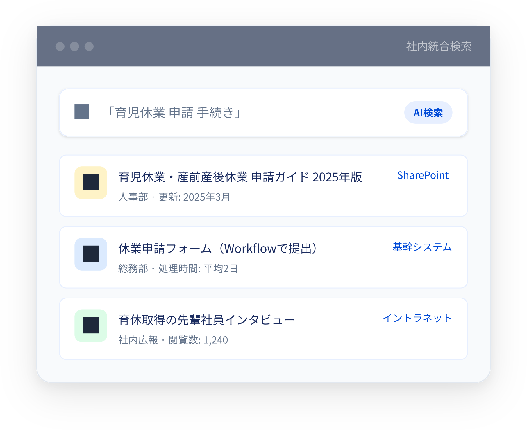 バラバラに存在するシステムの情報を、ひとつの場所から検索・アクセスできる環境に統合します。情報がどのシステムにあるかを覚える必要がなくなります。