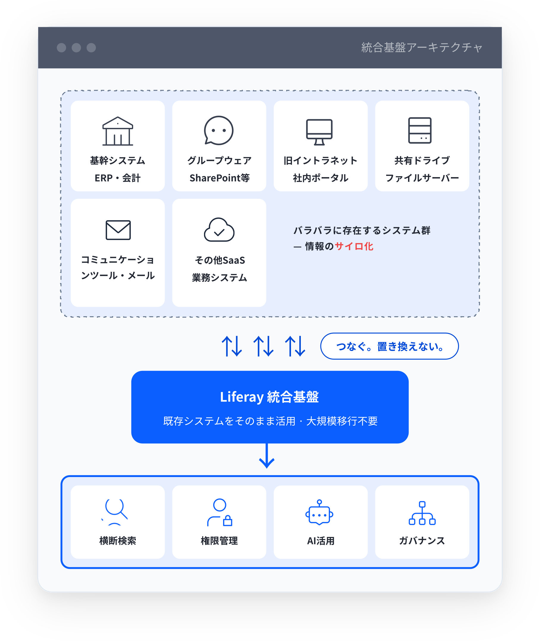 既存システムはそのままで。Liferayの統合基盤が、社内の情報・権限・AIを一元管理します。